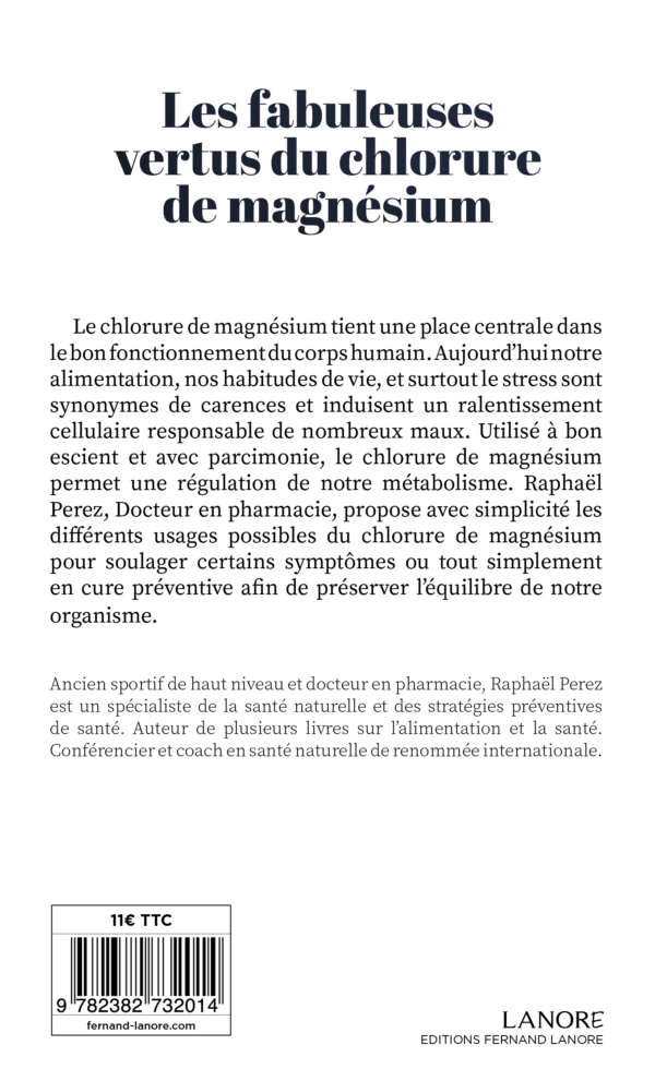 Le chlorure de magnésium tient une place centrale dans le bon fonctionnement du corps humain. Aujourd’huinotre alimentation, nos habitudes de vie, et surtout le stress sont synonymes de carences et induisent un ralentissement cellulaire responsable de nombreux maux. Utilisé à bon escient et avec parcimonie, le chlorure de magnésium permet une régulation de notre métabolisme. Raphaël Perez, Docteur en pharmacie, propose avec simplicité les différents usages possibles du chlorure de magnésium pour soulager certains symptômes ou tout simplement en cure préventive afin de préserver l’équilibre de notre organisme.